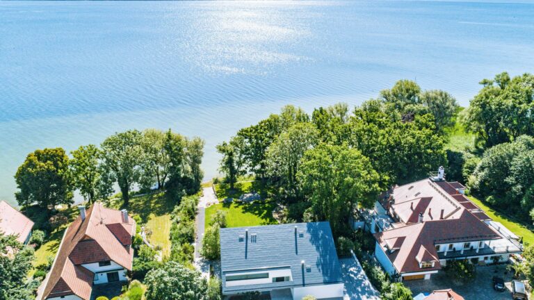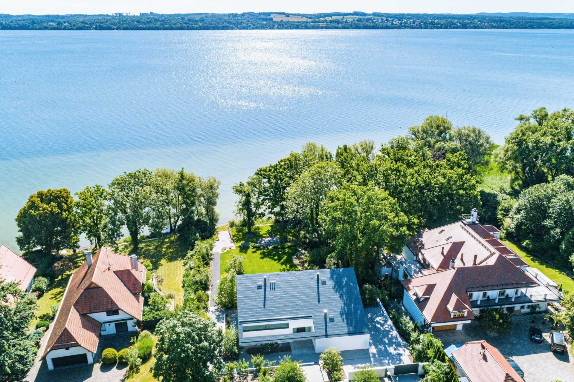 Eine elegant-moderne Villa am Ufer des Ammersees. Mit bodentiefen, breiten Fensterfronten über 3 Ebenen konsequent zum Garten und See ausgerichtet. Ein Uferbereich mit Schilf und altem Baumbestand, wie er idyllischer nicht sein kann. Eine sanft ins Wasser verlaufende, steinerne Rampe mit Elektroanschluss für Winde zum Auslassen und Einholen von Booten: Segel- oder Motorboot, Kajak oder Katamaran.