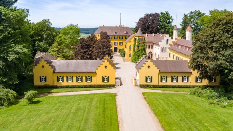 Tritt der Besucher am Ende der Auffahrtsallee aus dem schattigen Reich der Bäume, so weitet sich der Blick plötzlich und fällt - wie von Zauberhand - auf die goldgelb leuchtende Schlossanlage. Der hell-freundliche Kiesweg führt zielgerade durch gepflegte Rasenflächen und adrett geschnittene Buchsbäume - barocke Putten aus Stein grüßen - auf die breiten Seitenflügel des Schlosses zu.