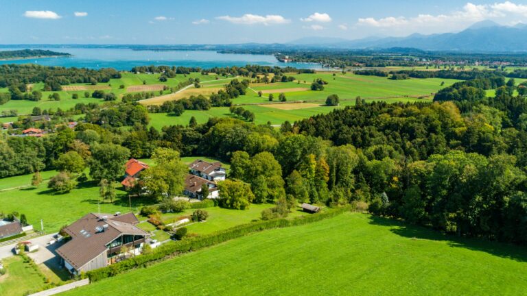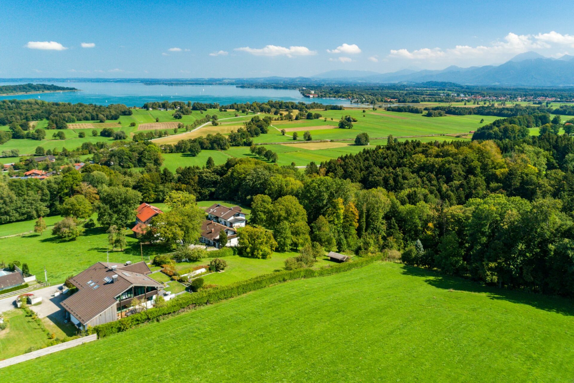 Auf einer Anhöhe oberhalb des Chiemsees, mit wunderbarem Blick auf den Chiemsee und die Insel Herrenchiemsee nach Osten und einem beeindruckenden Panoramablick auf die Bergkette der Chiemgauer Alpen nach Süden, liegt das weitläufige Grundstück mit Landhausvilla, zwei Sonnenterrassen, Gartenhaus, Tiefgarage und großzügigem Wellnessbereich.