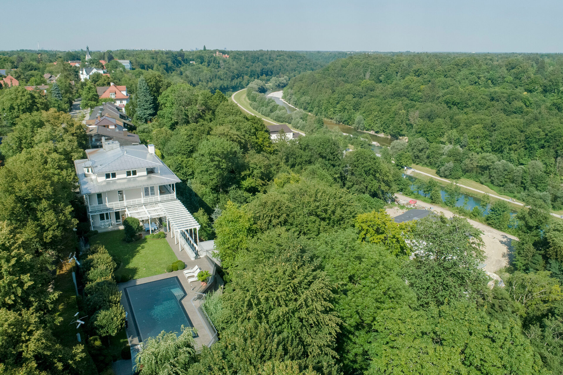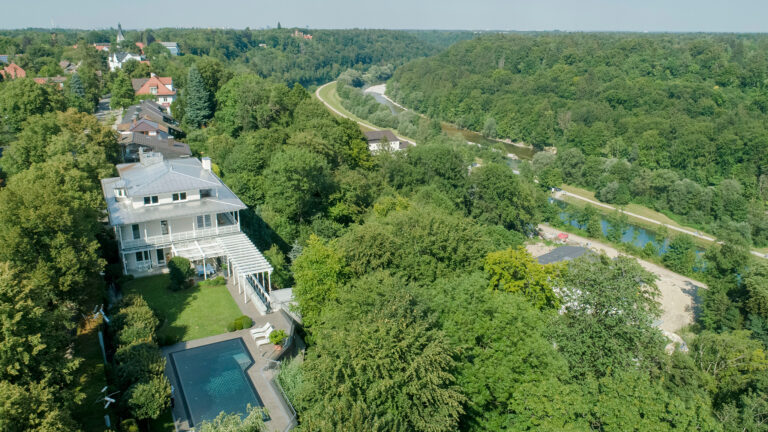 Das großzügige, repräsentative Villenanwesen liegt in einmaliger Lage am höchsten Punkt des Isarhochufers mit majestätischem Blick über Isartal und Fluss bis zur Bergkette der Alpen.
