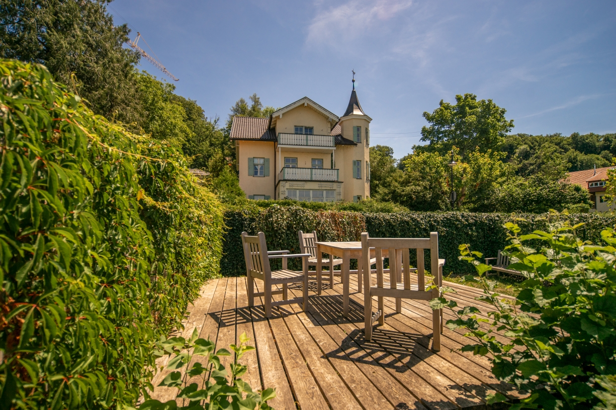Besser geht es nicht - direkter und privater Zugang zum Starnberger See im beschaulichen Leoni mit wunderbarem Fernblick über den Starnberger See bis in den malerischen Sonnenuntergang und die bayerischen Alpen. Die nach Westen ausgerichtete Villa, nicht zu nah am Ufer auf einer leichten Anhöhe gelegen, bietet bereits ab dem Erdgeschoss einen ungehinderten Ausblick auf den See. Durch die erhöhte Position und dem dezenten Abstand zum Ufer bietet sie zugleich die nötige Privatheit und Ruhe.