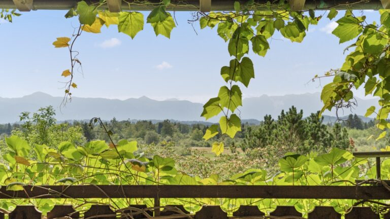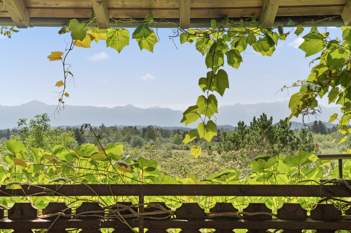 Ein großzügiges Anwesen, perfekt in die Landschaft eingebettet mit inspirierenden Blickachsen in die Weite der Natur. Ein freier und vollkommen unverbauter Blick auf das sich zum Garten nach Süden öffnende Panorama auf die Bergkette der Alpen und die davor liegenden grünen Wiesen, Felder und Wälder.